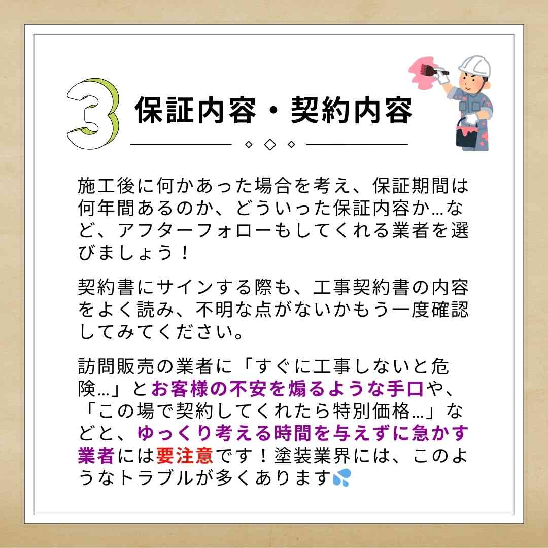 それなのに、『見積りの金額以外に追加料金をとられた…』『職人さんに手を抜かれたのが分かる仕上がりになっている…』『契約の際に話しをしていた営業マンと、現場の職人の話しが全然違う。営業マンは契約日以降現れない。この会社と契約するんじゃなかった…』などのトラブルが多くあります😭💦業者と契約する際にこのポイントを思い出してもらえると、こういったトラブルが少なくなるはずです👍